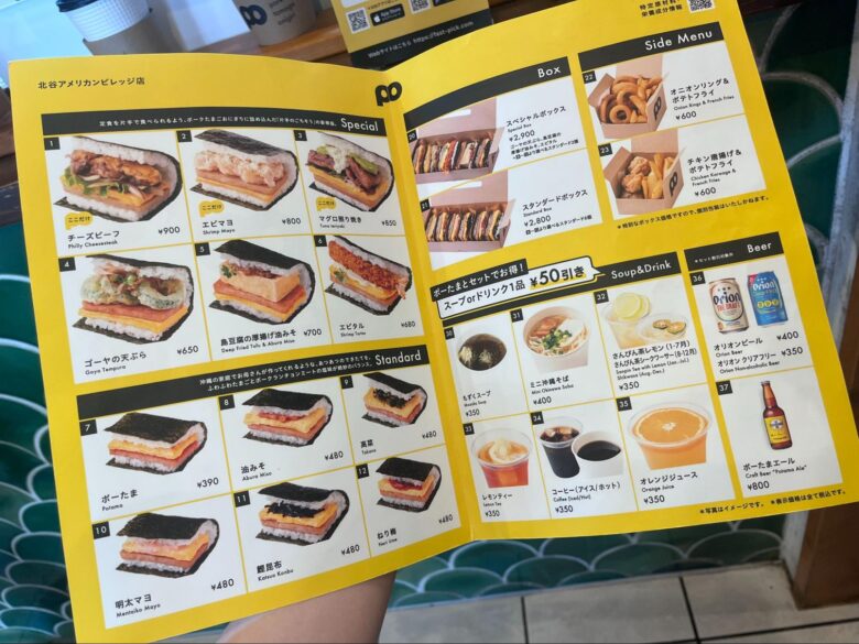 メニューは定番の「Standard Potama(スタンダード ポーたま)」から、ゴーヤの天ぷらやエビフライが入った「Special Potama(スペシャル ポーたま)」まで、なんと10種類以上!沖縄食材を使った限定メニューもあるので、あれもこれも試したくなります。