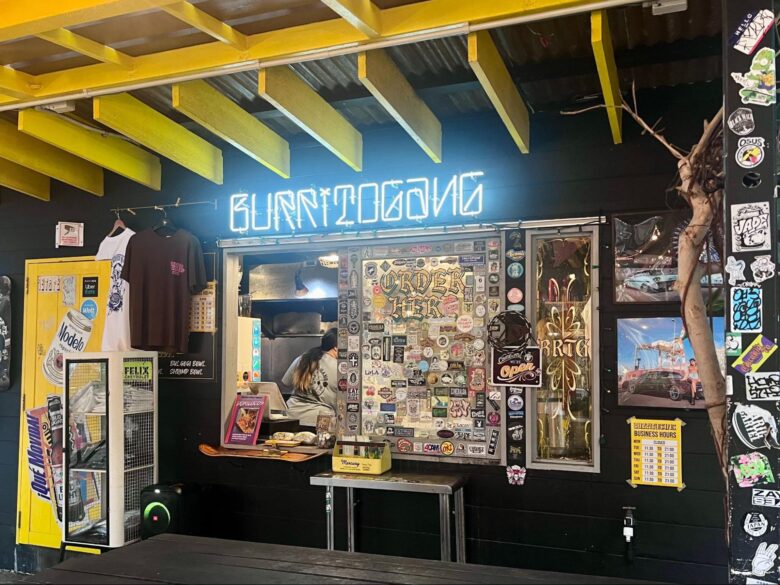 外観は、ストリート感あふれるステッカーがびっしりと貼られた窓と、ネオンの「BURRITO GANG」サインが目を引く存在感抜群のデザイン。