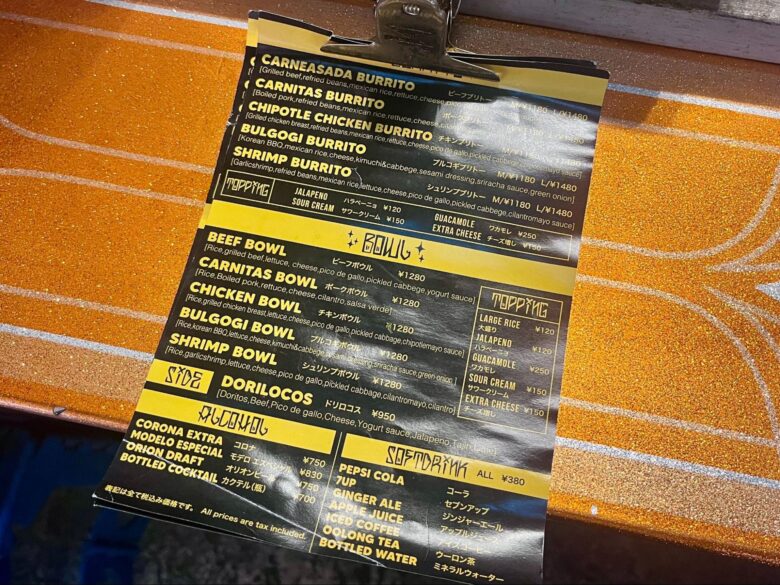 メニューには定番の「ビーフ」「チキン」「ポーク」「シュリンプ」など、アメリカンブリトー好きにはたまらないラインアップがずらり。