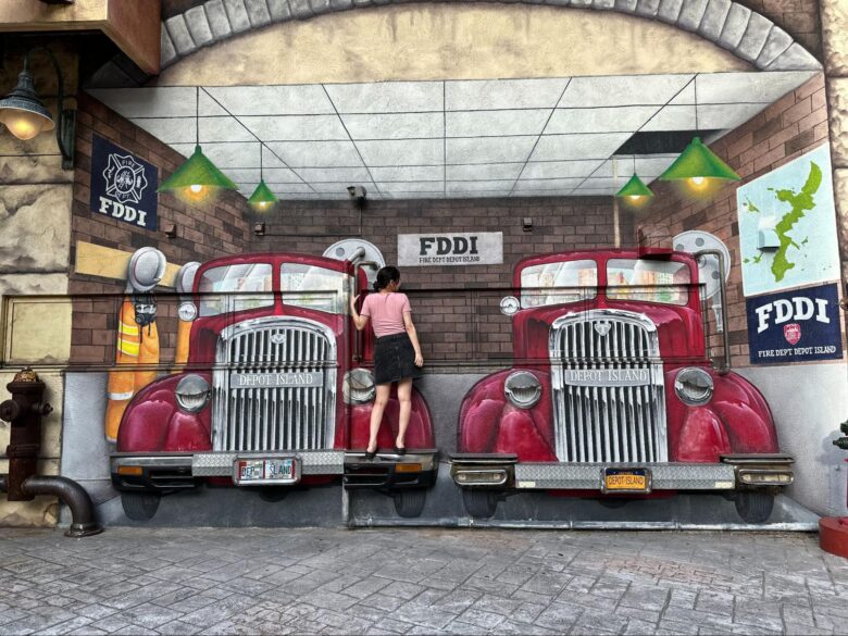 街のシンボルとして親しまれるこの消防車は、かつて地域の安全を守る“街の守り神”として描かれた背景があります。フロントバンパーをちょっとした踏み台に使えば、まるで消防車に乗り込んだかのような一枚が撮れますよ。