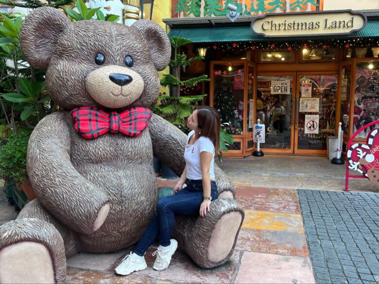 クマの足の上にちょこんと座るのが定番の撮影スタイル。大人でもしっかり座れるサイズ感で、お子様連れのファミリーはもちろん、カップルや女子旅にもおすすめ。ショップ前のカラフルな床や、店内にキラキラ光るツリーが映り込み、まるで絵本の中に入り込んだような1枚が撮れちゃいます。
