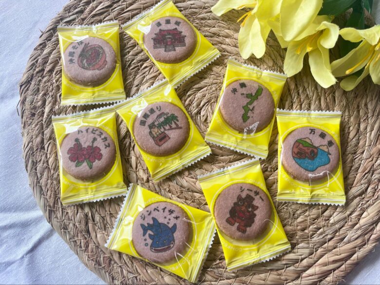 クッキーには、ハイビスカス、首里城、沖縄そば、国際通りなど、沖縄をモチーフにしたイラストがプリントされており、見た目にも楽しい一品。箱を開けた瞬間から、まるで沖縄の街を散歩しているような気分になれるデザインです。