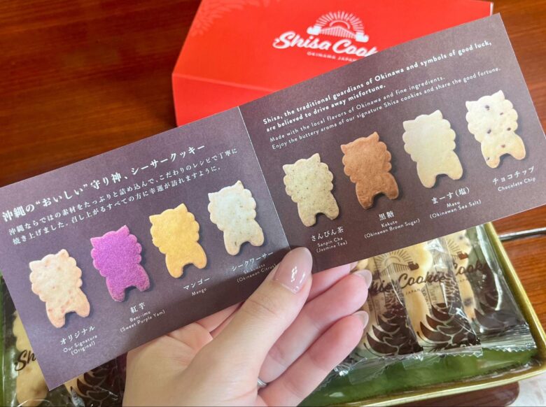 アソート8枚入りは、「オリジナル」「紅芋」「マンゴー」「シークヮーサー」「さんぴん茶」「黒糖」「まーす(沖縄の塩)」「チョコチップ」の全8種類の味を1枚ずつ楽しめる贅沢なセット。