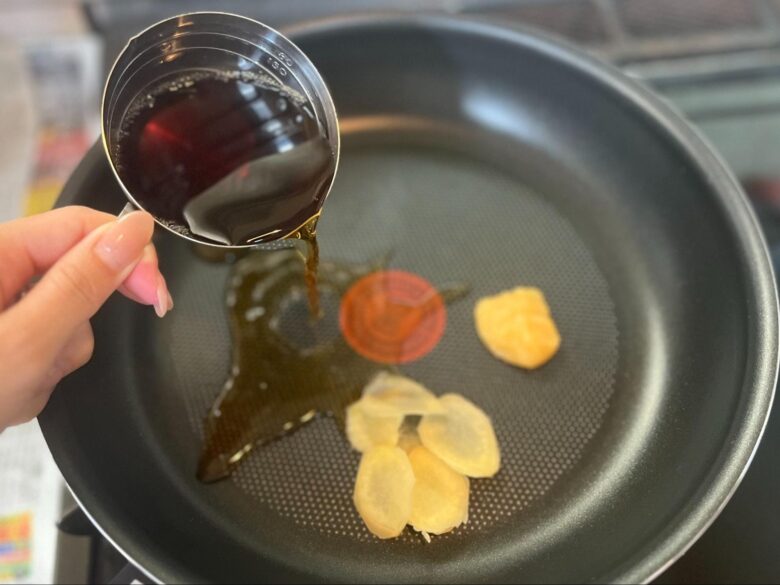 ①鍋に水とシークヮーサーぽん酢、しょうが、にんにくを入れ、中火で加熱する。