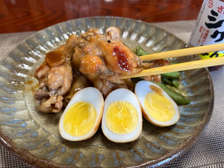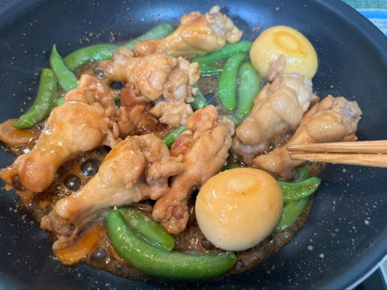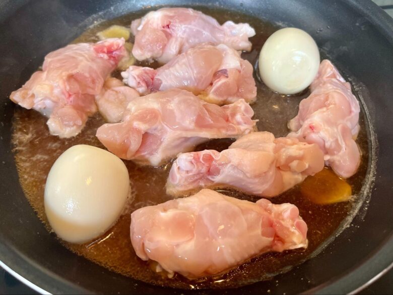 ②煮立ったら手羽元を加え、アクを取りながら15分ほど煮る。ゆで卵を加え、さらに5分ほど煮て味をなじませる。