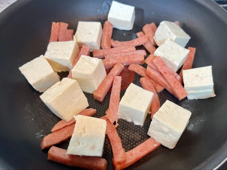 ②フライパンに油を熱し、ポークと豆腐を炒める。
