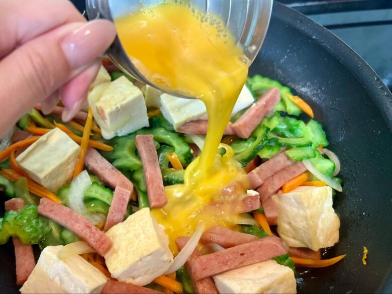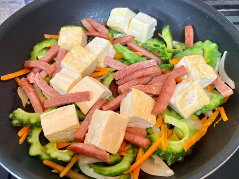 ④らくちんチャンプルー ゴーヤー袋の中身を投入してさらに炒める。