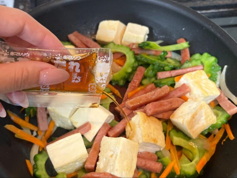 かつおエキスと醤油ベースの調味料が入っているので、用意するのはゴーヤーや豆腐、卵、豚肉などお好みの具材だけ。炒めて調味料を加えるだけで、誰でも簡単に本格的なゴーヤーチャンプルーが完成します。