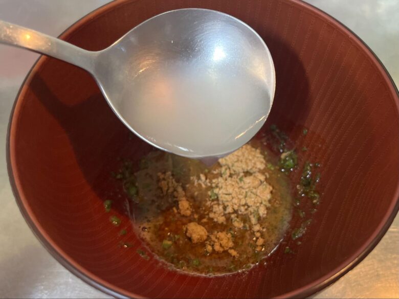 ③茹で汁を使って粉スープを溶かす。スープに冷たい水を加えて、さっぱりとした冷たいスープを作る。